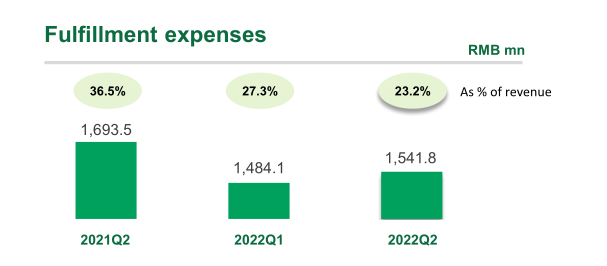 叮咚買菜2022年第二季度財報顯示,已經(jīng)逐漸降低了前置倉的履約費用率。第二季度履約費用為15.418億元,履約費用率為23.2%,同比下降了9.2%。與之相對的則是叮咚買菜第二季度的毛利率達到了31.6%,毛利率覆蓋了履約費用率,才實現(xiàn)了階段性的盈利。