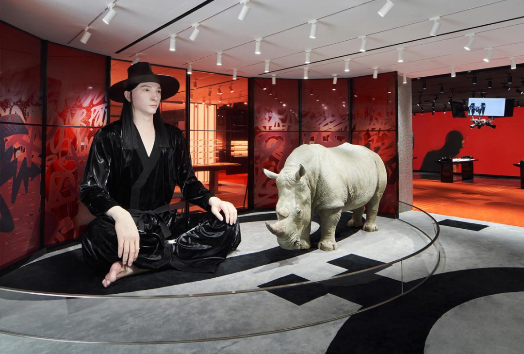 “浪費(fèi)”的空間給了眾多裝置藝術(shù)。從一層到三層,你依次會(huì)看見殘缺的熊型玩偶、席地而坐的黑衣機(jī)器人(機(jī)體使者)與犀牛(布告者)、體現(xiàn)品牌概念的六足機(jī)械蜘蛛,以及螞蟻外觀的巨型昆蟲裝置。