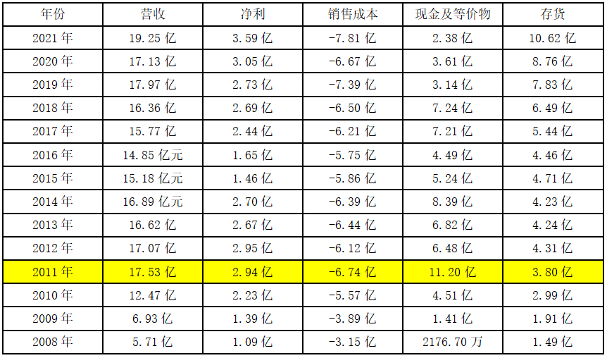公司業(yè)績止步不前的同時,現(xiàn)金及等價物逐年遞減,從上市時的11.2億下降到2021年的2.38億。另一方面,公司的存貨卻不斷高企,從2008年的1.49億增長至2011年的3.8億,到2021年已經(jīng)飛升至10.62億。