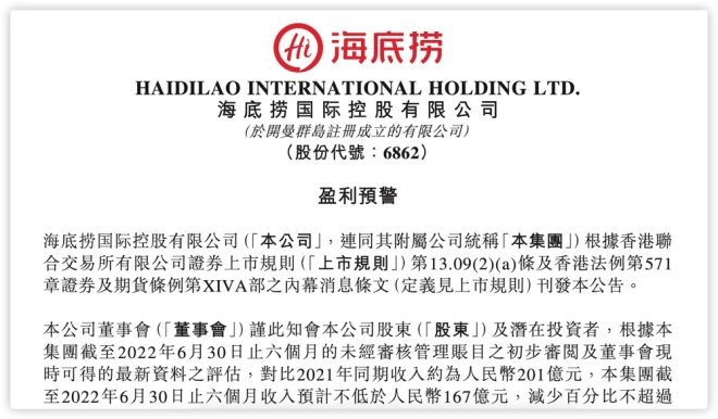 8月14日晚間,海底撈國(guó)際控股有限公司(股份代號(hào):6862)發(fā)布2022年上半年盈利預(yù)警。公告顯示,截止2022年6月30日止六個(gè)月中,海底撈收入預(yù)計(jì)不低于人民幣167億元,對(duì)比2021年同期收入約人民幣201億元,減少百分比不超過(guò)17%。