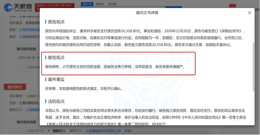 2022年7月,一則關于“買賣合同”的一審判決書中,被告方上海嘣嘣喵科技有限公司表示,“因業(yè)務已經(jīng)停頓,沒有現(xiàn)金流,被告準備申請破產(chǎn)”。兩年不到,繁榮集市即將走完它短暫的一生。