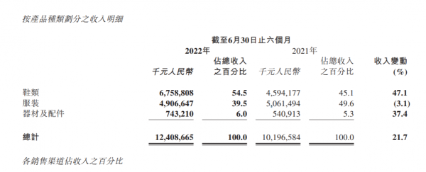 2022年上半年鞋類收入67.59億元,同比增長47.1%,服裝收入49.07億元,同比減少3.1%。