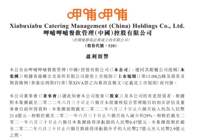 再說(shuō)呷哺呷哺,用了“虧損擴(kuò)大”一詞來(lái)表達(dá)上半年的慘烈。公告顯示,2022年上半年,呷哺呷哺預(yù)計(jì)營(yíng)收約21.6億元,同比下跌29.0%;凈虧損預(yù)計(jì)為2.7-2.9億元,較上一年度的虧損0.47億元相比同期虧損增幅474.47%-517.02%。