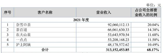 新茶飲供應(yīng)鏈企業(yè)沒有議價(jià)權(quán)的一大原因就是其嚴(yán)重的“大客戶依賴癥”,首先是其營收高度依賴新茶飲頭部品牌。