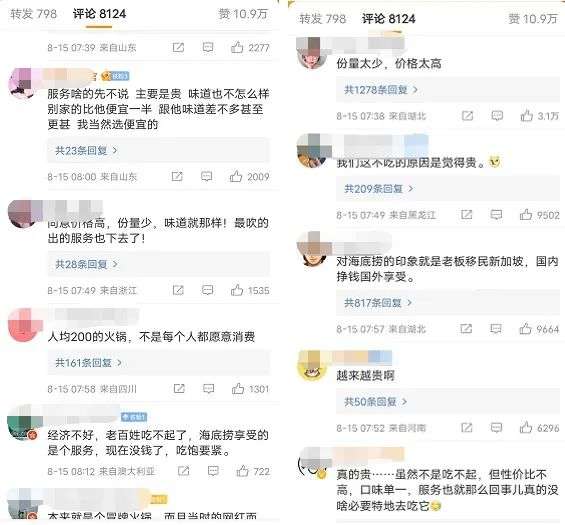 有的表示,老板移民新加坡,國內(nèi)掙錢國外享受,還有的認(rèn)為,經(jīng)濟(jì)不好,老百姓吃不起了,海底撈享受的是個(gè)服務(wù),現(xiàn)在沒錢了,吃飽要緊......