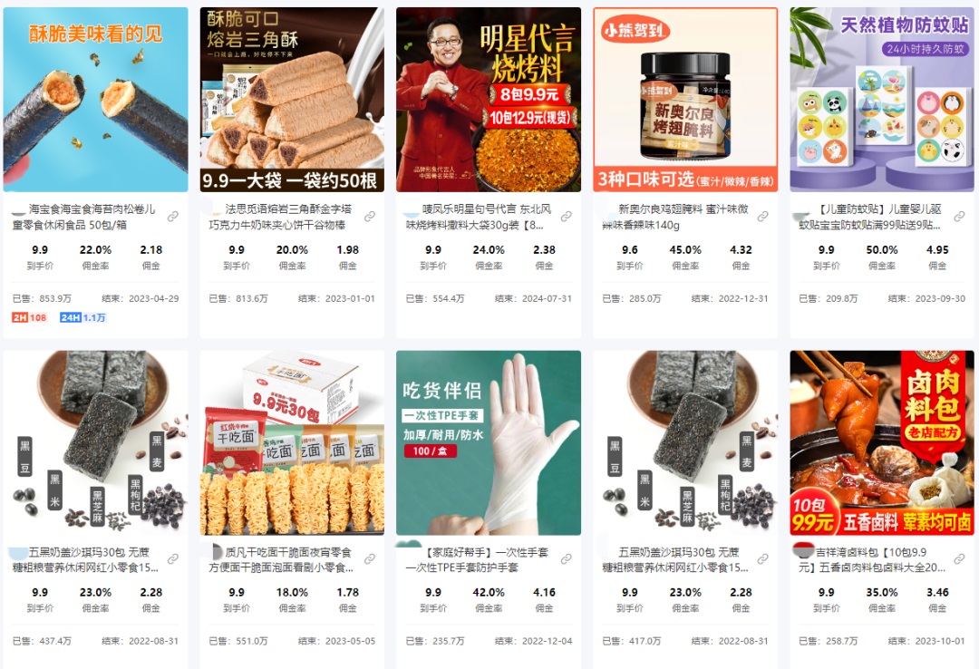 除此之外,鋅刻度在選品平臺(tái)的9.9元福利區(qū)發(fā)現(xiàn),其實(shí)9.9元商品的傭金并不像想象的那樣低,甚至大多傭金率都保持在20%至30%之間。具體來(lái)看,9.9元50包的海苔肉松卷傭金2.18元,傭金率22%;嘜鳳樂(lè)東北烤料30g大袋裝8包入,傭金2.23元,傭金率24%;吉祥灣鹵料包10包裝,傭金3.46元,傭金率35%;新奧爾良雞翅腌料140g,傭金4.32元,傭金率45%……