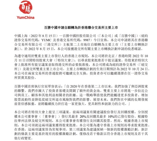 聯(lián)商快訊:8月15日晚間,百勝中國發(fā)布公告稱,申請自愿轉為于香港聯(lián)交所主要上市。
