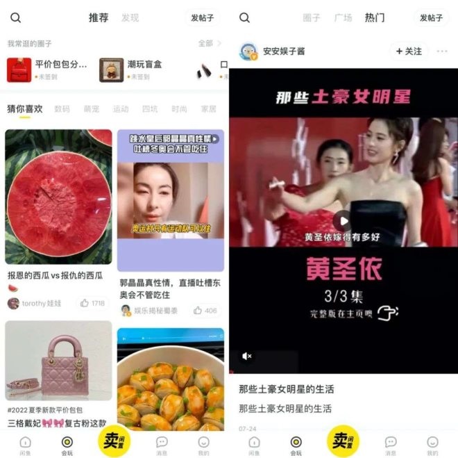 但8月上旬,閑魚突然大范圍整改了會玩版塊,將熱門欄(短視頻推薦流)砍掉,短視頻內(nèi)容融入圖文內(nèi)容,合并為推薦欄,原圈子欄則改為發(fā)現(xiàn)欄。這一大改動,說明閑魚已經(jīng)發(fā)現(xiàn),會玩版塊以往試圖以短視頻、圖文多線并行,以促進(jìn)轉(zhuǎn)化的路徑效果有限。閑魚社區(qū)需要流量去中心化,即向小紅書看齊。