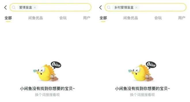 閑魚主要是通過不斷將違禁商品相關(guān)詞匯和暗語劃入違禁詞,對商品進(jìn)行審核、屏蔽和下架。暗語多是普通詞匯,不斷將這些普通詞匯劃入違禁詞庫,正常商品的曝光就無可避免地受到影響。例如有色情服務(wù)將暗語設(shè)置為“愛情盲盒”,當(dāng)閑魚將此暗語劃入違禁詞庫后,含有該詞匯的“鄉(xiāng)村愛情系列盲盒”這一詞條也無法檢索,相關(guān)商品自然沒有曝光量。