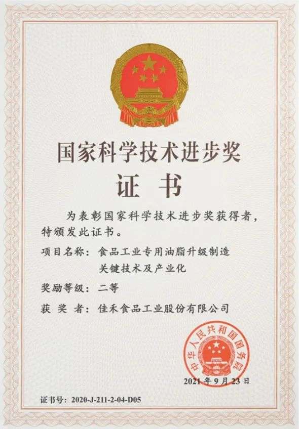 7個(gè)月后,佳禾食品憑借以“非氫化油脂技術(shù)”為基礎(chǔ)的食品專用油脂關(guān)鍵技術(shù)產(chǎn)業(yè)化,榮獲了“2020年度國(guó)家科學(xué)技術(shù)進(jìn)步獎(jiǎng)”。