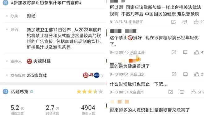 上周日,一則“新加坡將禁止奶茶果汁等廣告宣傳”的話題,沖上微博熱搜,閱讀量超過5億,評(píng)論區(qū)紛紛力挺,甚至還有人建議引入國(guó)內(nèi)。