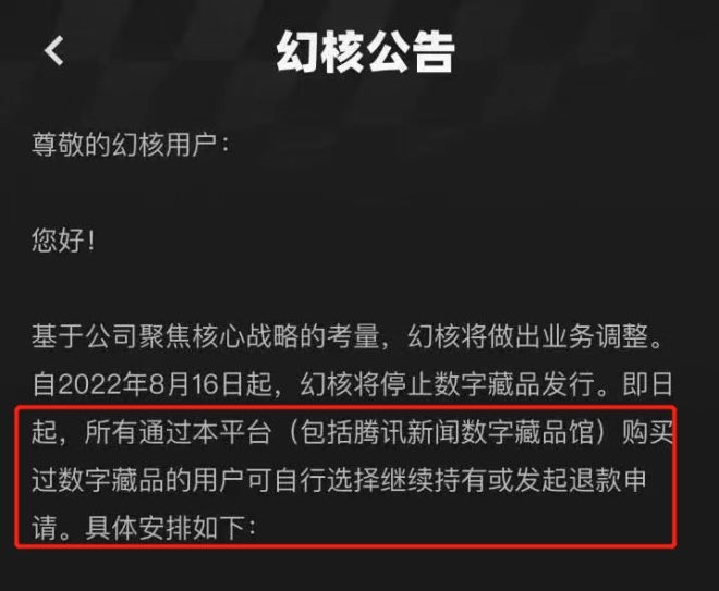 8月16日,國(guó)內(nèi)數(shù)字藏品頭部平臺(tái)騰訊幻核宣布,自當(dāng)日起將停止數(shù)字藏品發(fā)行。所有通過(guò)其平臺(tái)購(gòu)買(mǎi)過(guò)數(shù)字藏品的用戶(hù),可自行選擇繼續(xù)持有或發(fā)起退款申請(qǐng)。