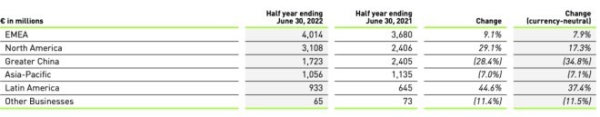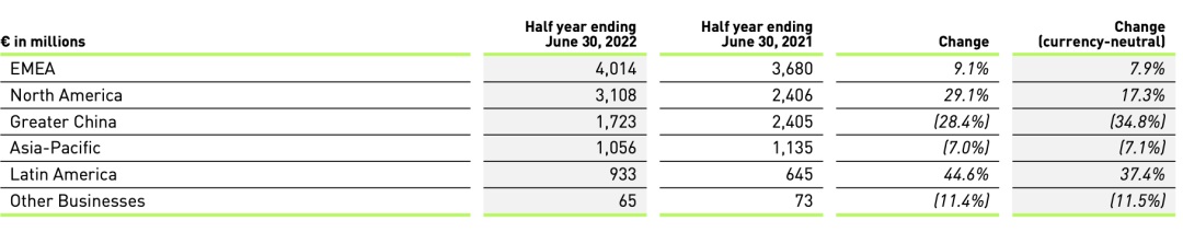 阿迪達(dá)斯2022年第二季度,各地區(qū)銷售額