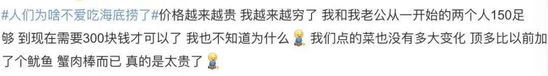海底撈預(yù)告上半年仍要虧近3億后,“人們?yōu)樯恫粣鄢院5讚屏恕钡巧衔⒉崴。這一話題下,最多的回答是“太貴”“沒錢”“吃不起了”。