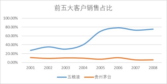 我們從同時(shí)期的前五大客戶(hù)占比中就能看出,五糧液在當(dāng)時(shí)渠道擴(kuò)張的同時(shí),前五大經(jīng)銷(xiāo)商占收入比重2006年達(dá)到了78.43%,而同期貴州茅臺(tái)的前五大經(jīng)銷(xiāo)商占比僅為11%。五糧液的銷(xiāo)售渠道命脈基本都掌握在“大商”手里。