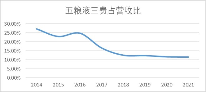 五糧液能夠止血離不開(kāi)醬香風(fēng)潮帶來(lái)的白酒行業(yè)紅利,也離不開(kāi)自身刮骨療毒的魄力。銷(xiāo)售渠道改革,前五大供應(yīng)商占比從最高點(diǎn)78.43%下降到2021年的9.15%,加強(qiáng)了企業(yè)自身對(duì)下游渠道的掌控力。另外品牌線的削減也降低了企業(yè)冗雜的費(fèi)用支出,五糧液的三費(fèi)支出占比由2014年的27.12%下降至2021年的11.59%。已經(jīng)同茅臺(tái)的三費(fèi)占比(9.37%)趨于一致。
