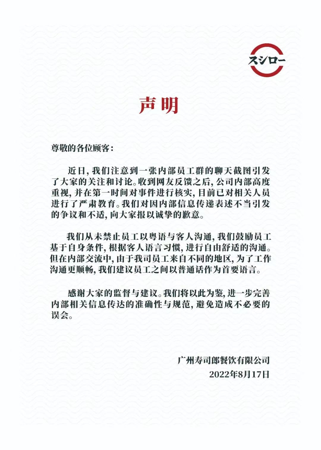 壽司郎廣州門(mén)店禁止員工上班說(shuō)粵語(yǔ)?官方回應(yīng)