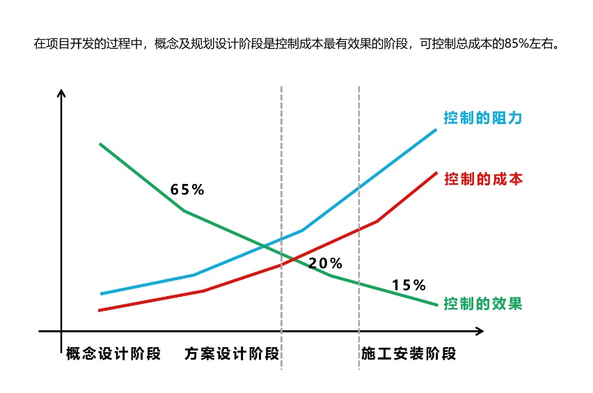 控制建設成本牽涉到從項目預算開始,一直到項目完成后決算的各個環(huán)節(jié),但是在諸多的流程中,概念及規(guī)劃設計階段是控制成本最有效的階段。
