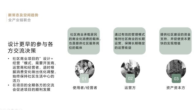 社區(qū)商業(yè)項目的”設計+經(jīng)營“模式,需要開發(fā)商、運營商和經(jīng)營者,適時根據(jù)消費變化做出優(yōu)化調(diào)整,始終保持社區(qū)生活中心的活力,在項目的全期各方的交流會促進項目的順利發(fā)展。