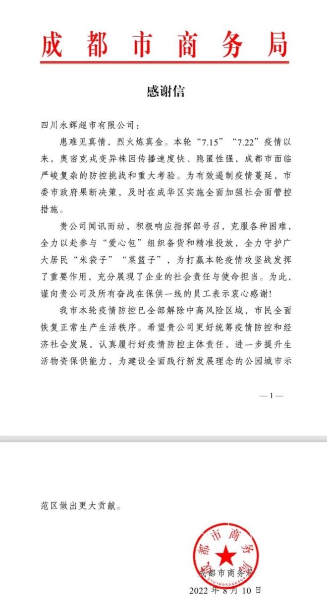 近日,四川永輝超市收到一封來自成都市商務(wù)局的感謝信。