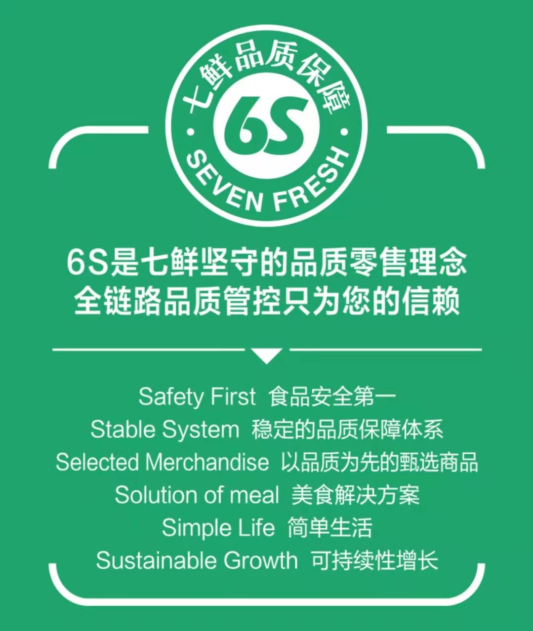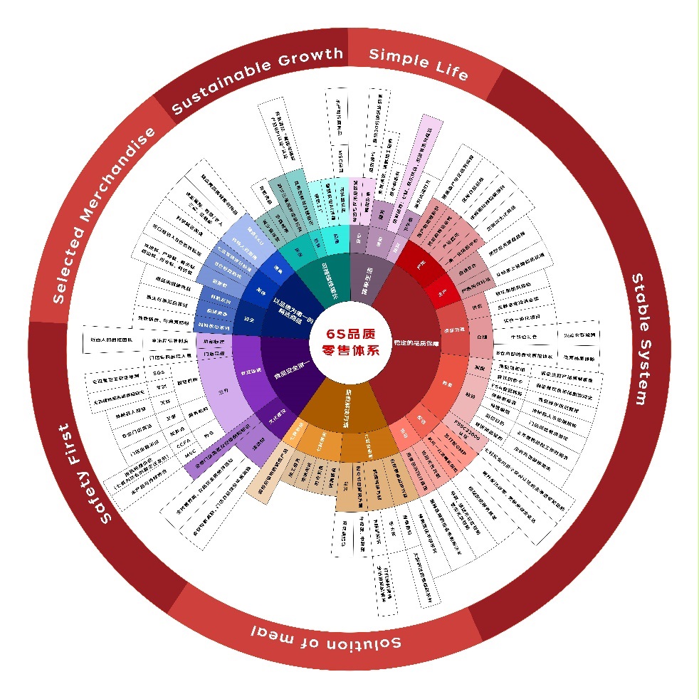 6S品質(zhì)零售體系即食品安全第一(Safety First)、穩(wěn)定的品質(zhì)保障體系(Stable System)、以品質(zhì)為第一的精選商品(Selected Merchandise)、美食解決方案、(Solution of meal)、簡單生活(Simple Life)、可持續(xù)性增長(Sustainable Growth )。