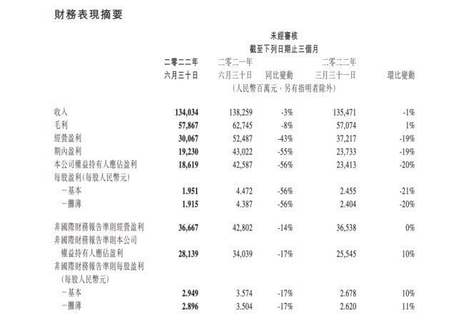 8月17日晚間,騰訊控股發(fā)布 2022 年第二季度財(cái)報(bào)。本季度騰訊總營(yíng)收1340.34億元,同比下滑3%;凈利潤(rùn)186.19億元,同比下滑56%,直接腰斬;非國(guó)際財(cái)務(wù)報(bào)告準(zhǔn)則下凈利潤(rùn) 281.39 億元,同比下滑 17%。