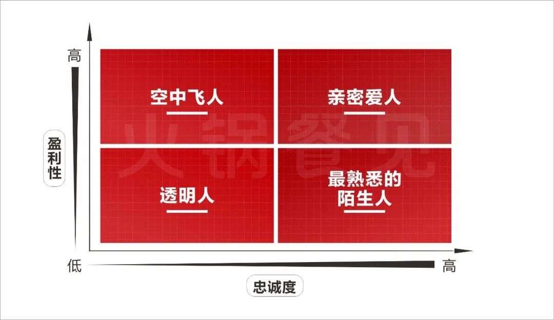 客流量對(duì)營(yíng)業(yè)額的影響極大,沒(méi)有客流量,后面的所有參數(shù)都毫無(wú)意義。要提升客流量,必須先分清顧客類(lèi)型。按照顧客對(duì)火鍋店的“忠誠(chéng)度與盈利性”劃分,可分為4類(lèi)群體。