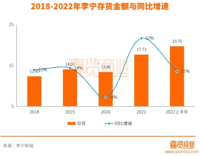 一方面,存貨困局。2021年,李寧存貨金額17.73億元,同比上漲4.27億元,增長(zhǎng)32%;2022上半年,存貨金額19.76億元,同比上漲2.03億元,同比增長(zhǎng)11%。除了2020年出現(xiàn)過(guò)微弱的下降幅度,李寧的存貨金額幾乎是處于一個(gè)緩步上升的趨勢(shì)。