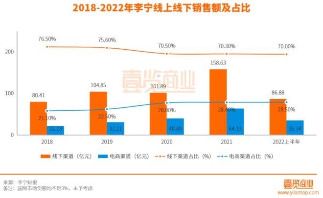 也就是說(shuō),李寧目前主要銷(xiāo)售渠道仍然為線下,線下渠道占總銷(xiāo)售額的70%,線上渠道占比不足30%,而且還存在下跌的趨勢(shì)。同為運(yùn)動(dòng)品牌的安踏,2020年線下渠道占比已經(jīng)超過(guò)30%,而且2021年仍然有明顯上升趨勢(shì),線上渠道占比增加1.9%。反觀李寧,線上渠道占比始終未超過(guò)30%,近些年來(lái)占比也一直未發(fā)生較大變化,2022上半年線上渠道占比甚至出現(xiàn)了同比減少的情況。