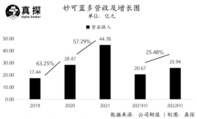 營收方面,2022年上半年,公司總營收為25.94億元,同比增速為25.48%。而根據(jù)往期財(cái)報(bào),妙可藍(lán)多2020年和2021年?duì)I收分別同比增長(zhǎng)63.25%、57.29%,今年一季度營收增速也在30%以上。