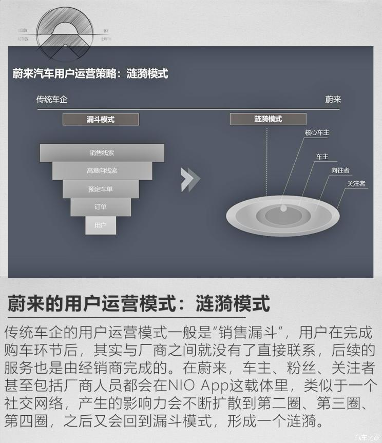 蔚來用漣漪模式來描述用戶運(yùn)營策略,相較于傳統(tǒng)車企的銷售漏斗模式,蔚來將所有用戶匯聚在運(yùn)營容器之中,品牌方可以與核心車主、車主、向往者、關(guān)注者相互交流、相互影響,再進(jìn)行轉(zhuǎn)化,形成一個(gè)漣漪。體系更復(fù)雜,看似運(yùn)營成本更高,但因?yàn)樗惺侄味贾赶蚺c消費(fèi)者持續(xù)保持著關(guān)系,更容易通過口碑的方式獲得用戶。