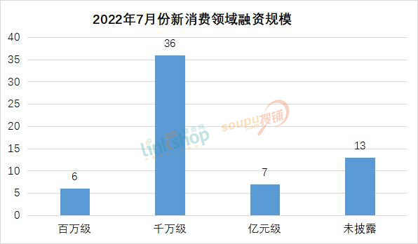 從融資規(guī)模來看,7月份融資以千萬級為主,達36次。百萬級融資數量較少,這個級別的融資多集中在天使輪和種子輪,多為食品、飲料、元宇宙等領域中小品牌。