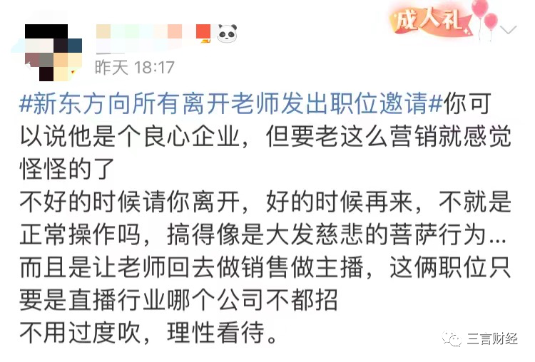 有網(wǎng)友稱,可以說新東方是個(gè)良心企業(yè),但要老這么營銷就感覺怪怪的了。而且是讓老師回去做銷售做主播,這倆職位只要是直播行業(yè),哪個(gè)公司都招。不用過度吹,理性看待。