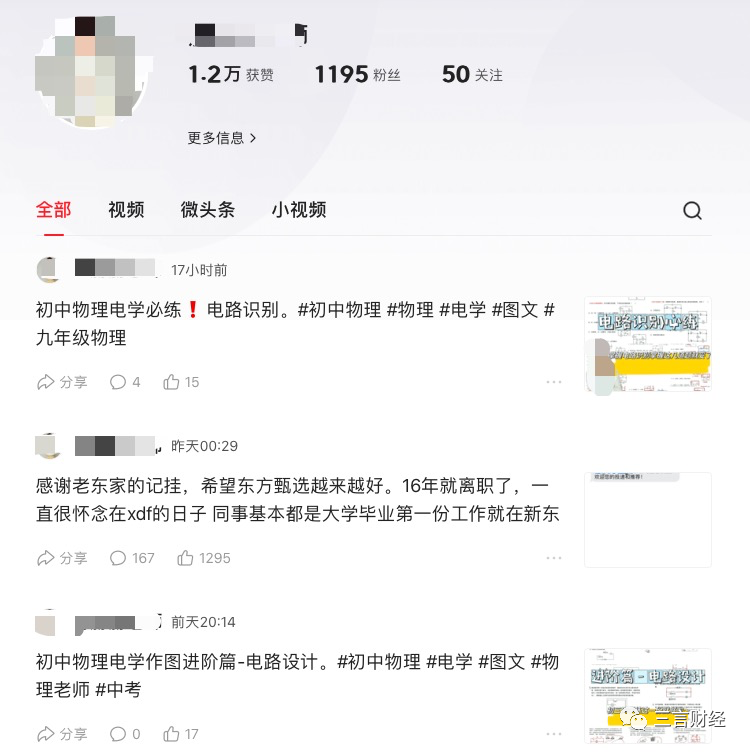 從這名收到新東方邀請(qǐng)短信的老師的頭條號(hào)動(dòng)態(tài)來看,她應(yīng)該是通過短視頻平臺(tái)教初中物理課。