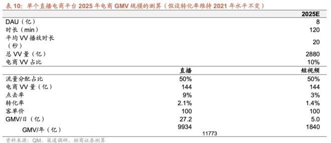 當轉(zhuǎn)化率維持2021年直播2.1%,短視頻1.4%的平均水平時,2025年單個直播電商平臺的GMV將達11773億元;