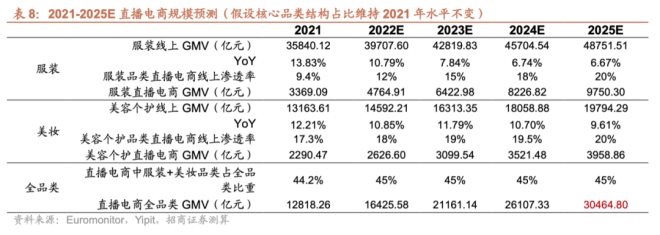1、品類的線上化率:根據(jù)歐睿數(shù)據(jù),2021年服裝、美妝品類線上銷售占比分別為35.4%和38.7%,在直播電商的推動下,兩大品類的線上化率在2025年預計能達到40%和42%。