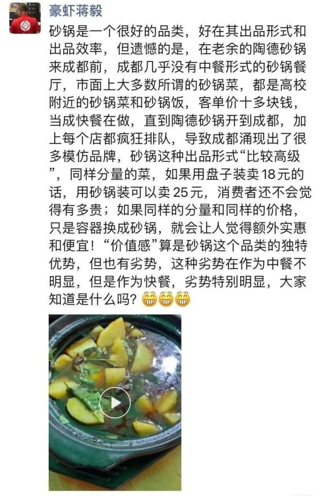 紅餐網(wǎng)專欄作者、成都豪蝦傳創(chuàng)始人蔣毅曾在其朋友圈表示, 限制砂鍋菜連鎖發(fā)展的一大問題就是效率。