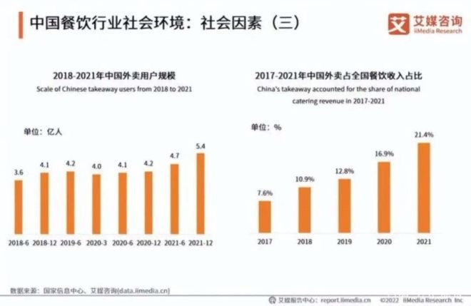在本地生活業(yè)務(wù)中,外賣是最大的一塊蛋糕。艾媒咨詢的報告顯示,2022年外賣用戶的規(guī)模人數(shù)和外賣收入在餐飲總收入的占比不斷增長。截止到2021年底,外賣用戶的規(guī)模從2018年的4.1億人增長至5.4億人,外賣收入的占比增長到餐飲總收入的21.4%。