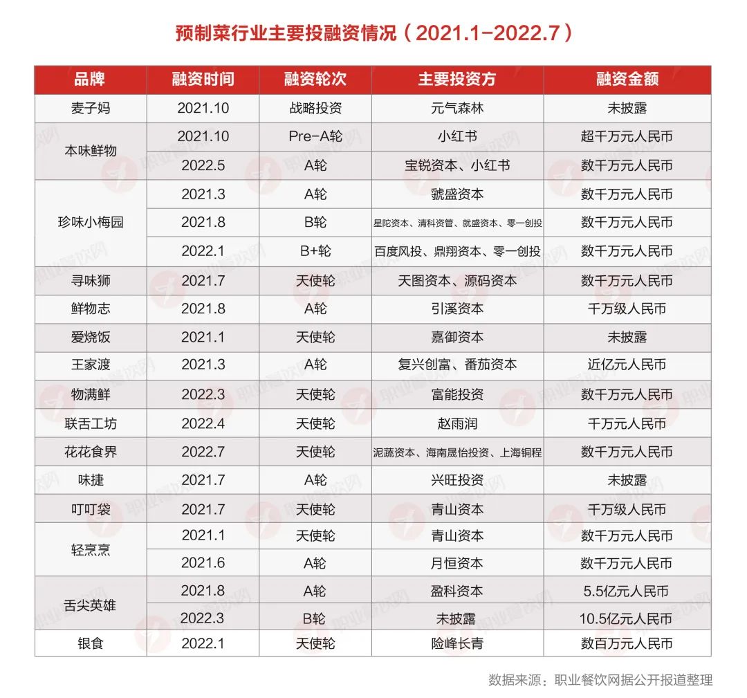 其中僅2021年—2022年,預制菜行業(yè)融資事件就有20余起,融資金額達數(shù)百億元。珍味小梅園、三餐有料、尋味獅、望家歡等預制菜上下游各企業(yè)前后都在2021年獲得融資,IDG資本、美團龍珠、百度風投等資本都在預制菜賽道上押注。