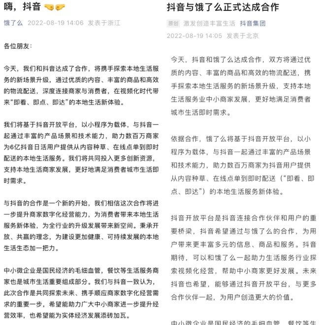 雙方的官宣通稿解釋稱,依據(jù)合作,在抖音開放平臺(tái),以餓了么小程序?yàn)檩d體,雙方將助力數(shù)百萬商家為6億抖音日活用戶提供從內(nèi)容種草、在線點(diǎn)單到即時(shí)配送的本地生活服務(wù)。