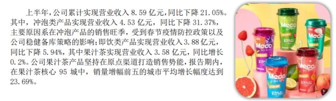 拆解其半年報(bào),財(cái)經(jīng)無(wú)忌發(fā)現(xiàn),兩大業(yè)務(wù)板塊沖泡類(lèi)與即飲類(lèi)產(chǎn)品分別實(shí)現(xiàn)營(yíng)業(yè)收入4.53億元、3.58億元,同比分別下降31.37%與5.94%。