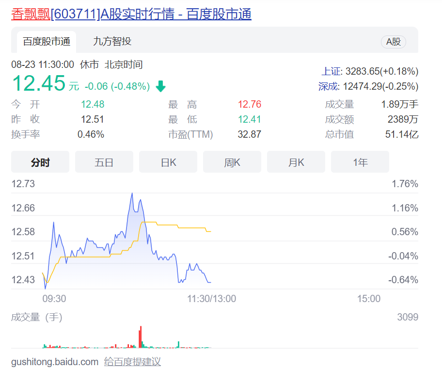 截至8月23日午間休市,香飄飄報(bào)收12.45元/股,總市值約51.14億元,與2019年的峰值37.68元/股相比,股價(jià)跌幅接近七成,市值蒸發(fā)近百億。