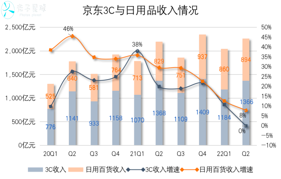 本季度,京東3C家電營(yíng)收1366億元,同比微降0.1%。經(jīng)過(guò)幾年反復(fù)之后,3C家電營(yíng)收占京東零售營(yíng)收比重得到了某種修正,從2020Q2的64%,回落到到本季度的57%,使得兩大品類(lèi)趨于均衡。