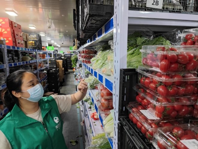 ▲圖為工作人員在前置倉(cāng)分揀本地農(nóng)產(chǎn)品。(攝影:王婷)