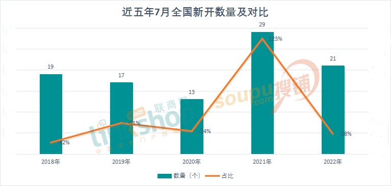 7月全國(guó)新開21個(gè)商業(yè)項(xiàng)目,同比2021年的29個(gè)下滑了28%。不過除了2021年,今年7月的開業(yè)數(shù)量在近五年并不少,除了疫情最嚴(yán)重的2020年,相對(duì)比較平均。