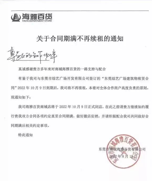 海雅百貨南城店主體運營公司東莞市南城海雅百貨有限公司發(fā)布給商戶的通知顯示,在今年10月9日與房東的租期到期后,不再續(xù)租,選擇正式閉店歇業(yè)。