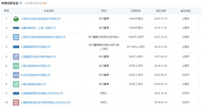 天眼查資料顯示,蒯佳祺目前在11家企業(yè)任職,其中,在上海京東到家元信信息技術(shù)有限公司擔(dān)任執(zhí)行董事,該公司注冊(cè)資本為70000萬(wàn)美元。