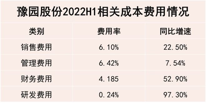 財報數(shù)據(jù)顯示,豫園股份2022上半年其成本費用均呈現(xiàn)上升趨勢。其中,財務研發(fā)費用率的同比增速最大,達到97.3%。