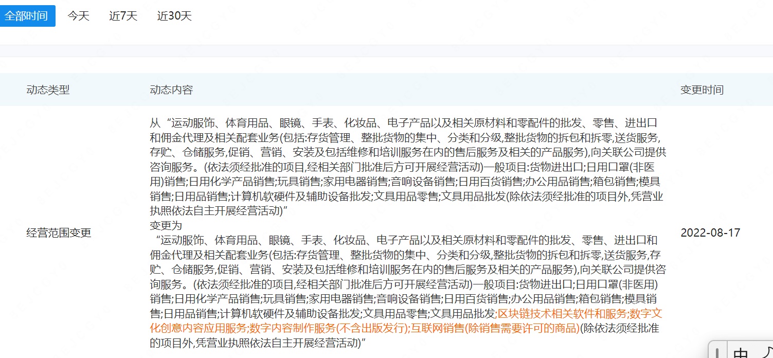 企查查APP顯示,近日,阿迪達(dá)斯體育(中國)有限公司發(fā)生工商變更,公司經(jīng)營范圍新增區(qū)塊鏈技術(shù)相關(guān)軟件和服務(wù)、數(shù)字文化創(chuàng)意內(nèi)容應(yīng)用服務(wù)、數(shù)字內(nèi)容制作服務(wù)(不含出版發(fā)行)等。