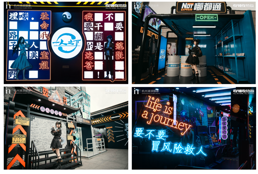 展覽包括異人世界入口、街機區(qū)“羅天大醮演‘武’場”、異人委托事務局、碧游村口一日游、天師下山&風后奇門、人間客酒吧、哪都通快遞等7大場景。通過對整個空間的創(chuàng)新演繹,整個街區(qū)充滿了賽博朋克風格的 “異人世界”,迅速引爆社交媒體,為杭城動漫愛好者帶來了一場沉浸式的動漫體驗。